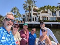 2025 was also a significant boating year. Don completed the many requirements for a Coast Guard Captain's license (the Coast Guard call it an OUPV) and it was issued to him at the end of the year. We celebrated with some friends boating the waterways of Fort Lauderdale. Don's sunfish served its purpose in getting the required days of experience, so Don sold it. Now it is a yacht toy. (No, that isn't our yacht, just the sunfish on the deck.)